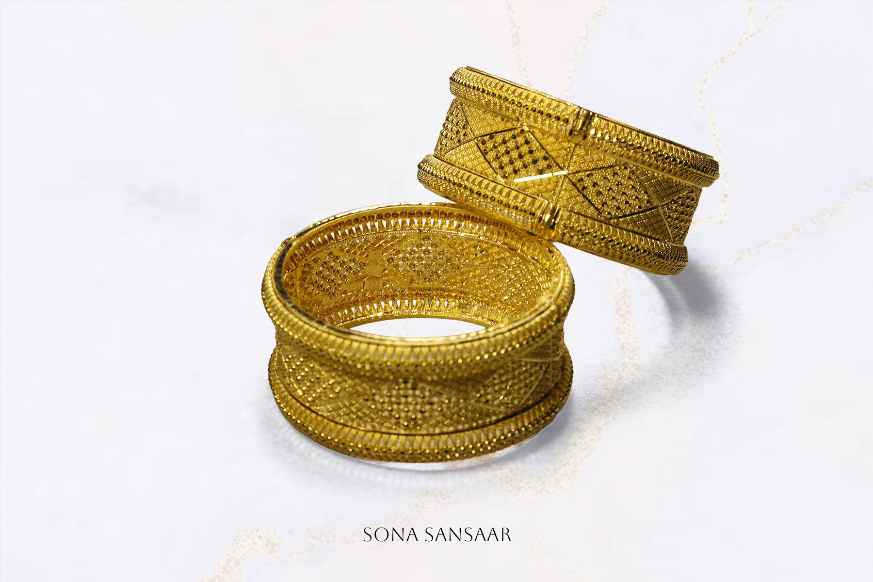The stunning Heirloom 22k gold bangles are what we call "proper gold", the kind that makes other jewelry jealous. Weighing in at 50.98 grams, this pair features intricate mesh work that catches light from every angle, with delicate beaded borders framing the classic diamond-cut pattern. The broad design sits beautifully on the wrist, substantial enough to make a statement but crafted with such fine detail that you'll find yourself admiring them throughout the day. These are the bangles you reach for when you want to feel like royalty perfect for weddings, festivals, or honestly, just Tuesday if you're feeling fancy. The timeless design means they'll look just as gorgeous decades from now as they do today.