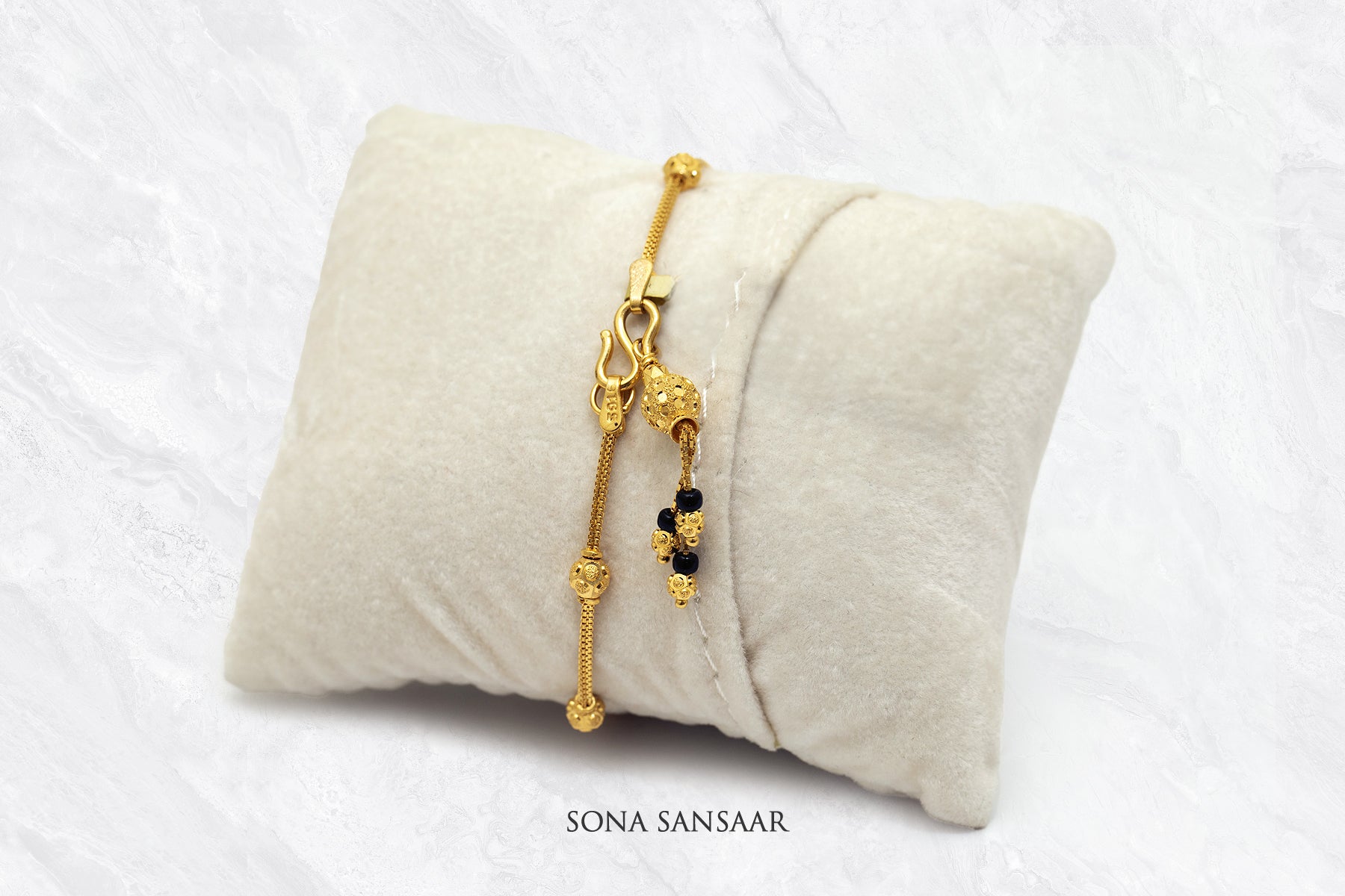 Introducing the Nightfall Mangalsutra Bracelet, crafted with 22k gold and weighing 7.05g, this elegant piece embodies the serene beauty of twilight. The contrast between lustrous black beads and gleaming golden spheres shows the delicate transition from day to night. Each gold sphere is meticulously crafted to reflect light subtly, while the black beads add a timeless touch of mystique.