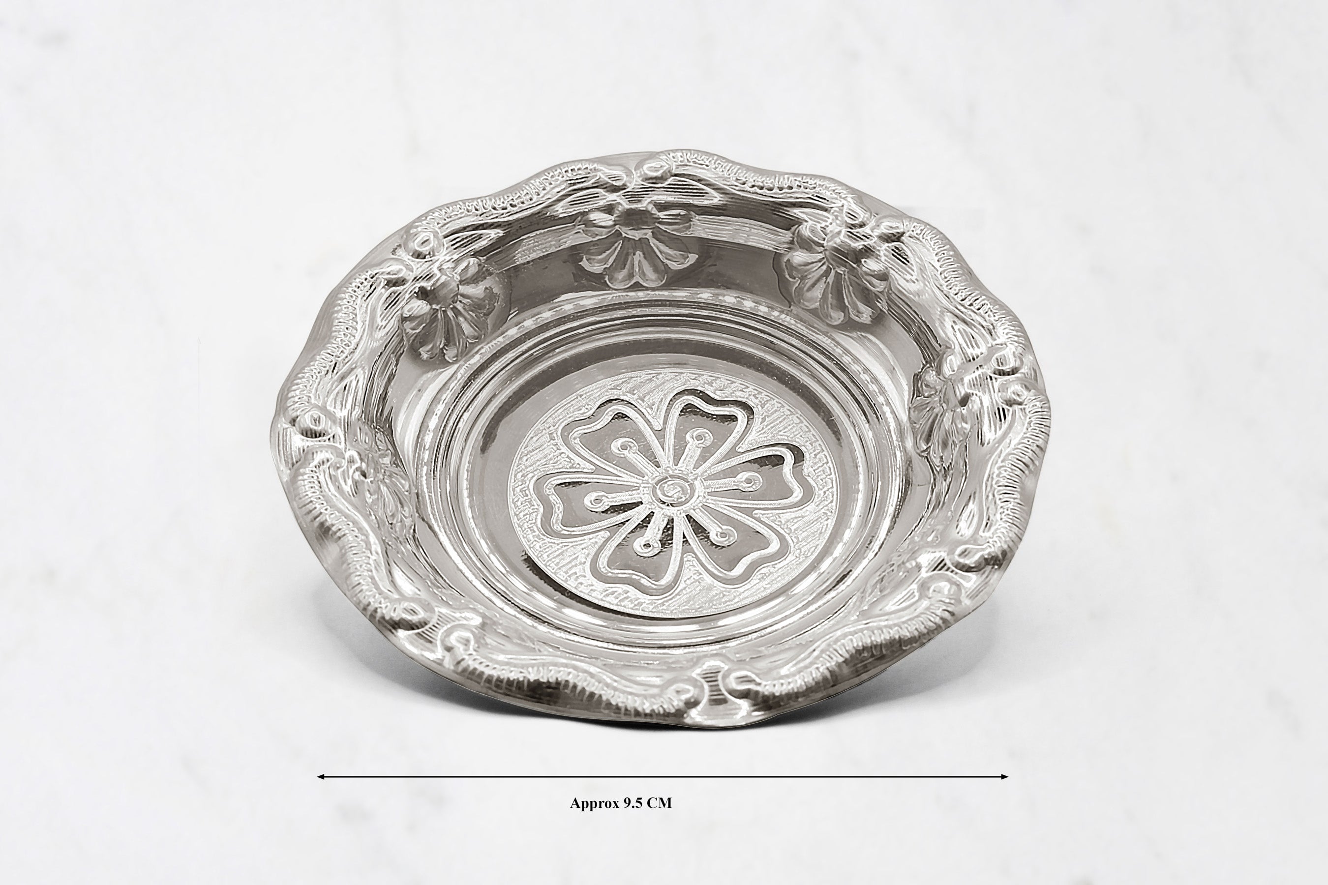 A small plate with a 6 petal stemmed flower design. Made of pure silver, hallmarked 925.